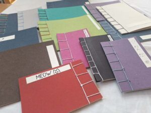 A műhely csodás kiállítótér is egyben, ahol a könyvkötészetről, kalligráfiáról és egyéb díszítő eljárásokról, pl. suminagashi technikáról tanulhattunk.